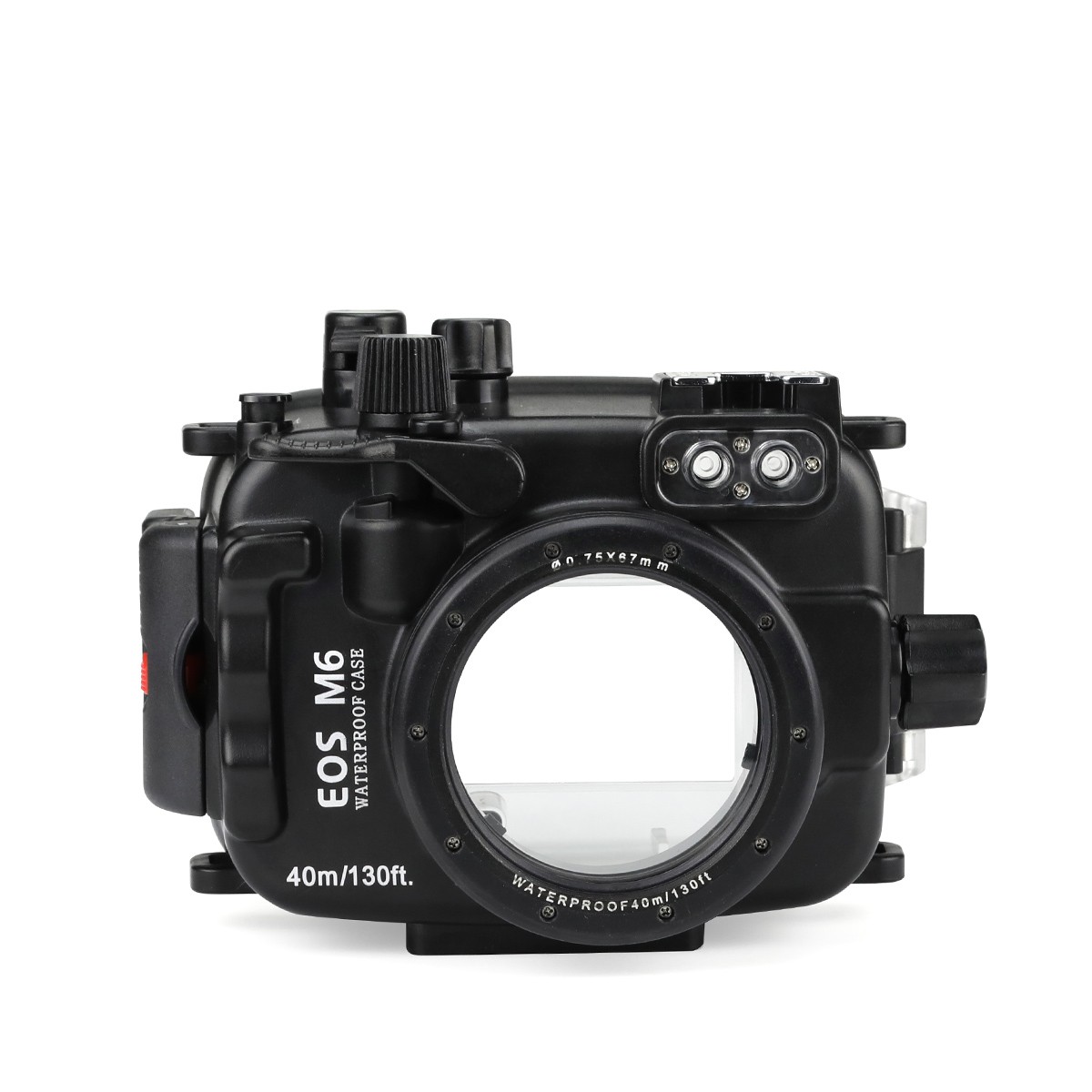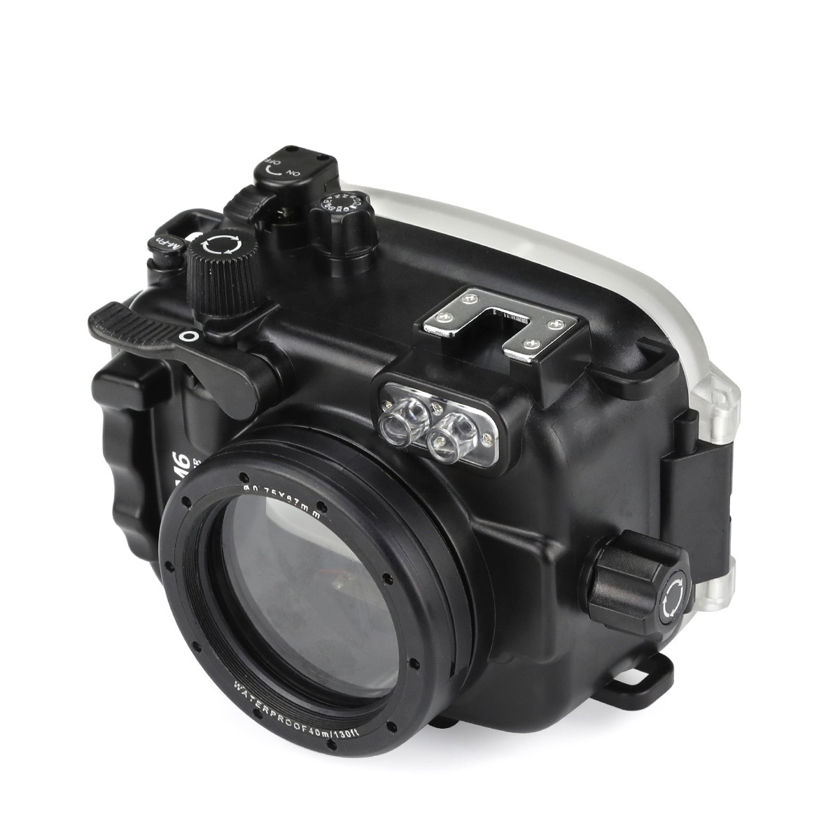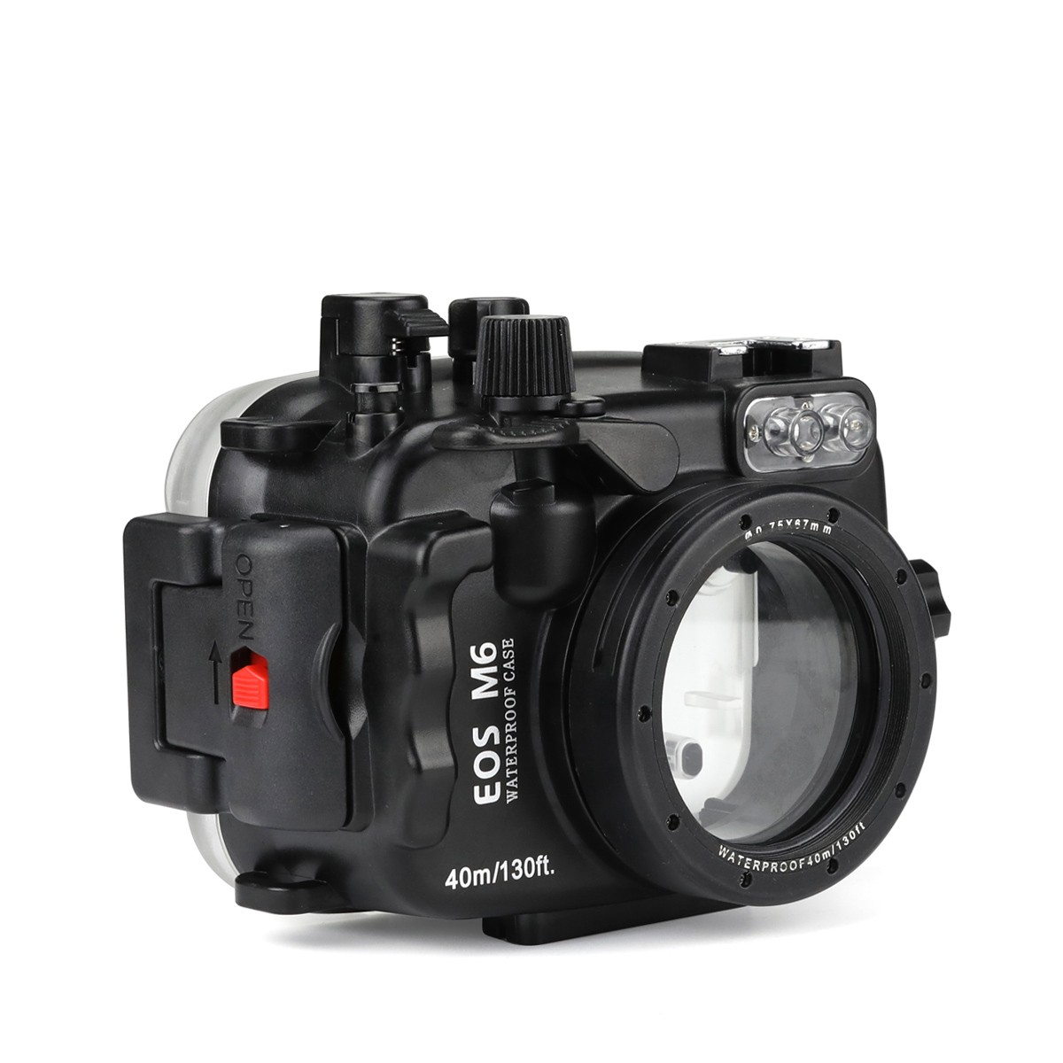 The shock-proof underwater housing is made of black polycarbonate with a window made of tempered glass to be admitted to a depth of 40 meters.