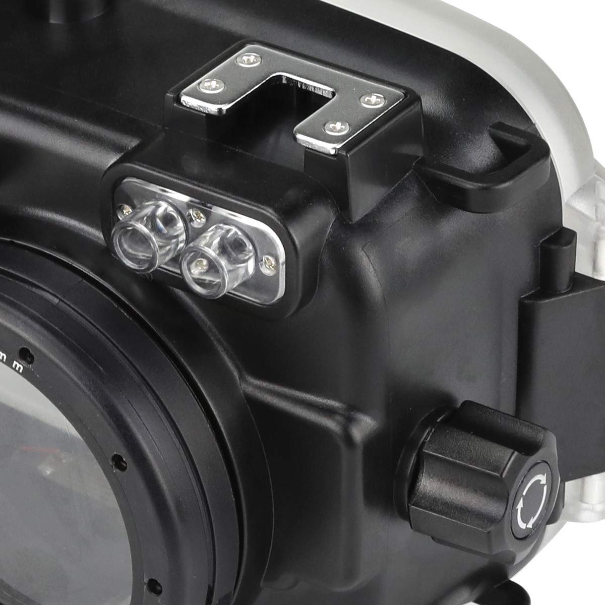 The underwater housing has two 1/4 tripod threads for grip and tray assemblies, or adapters for attaching various accessories.